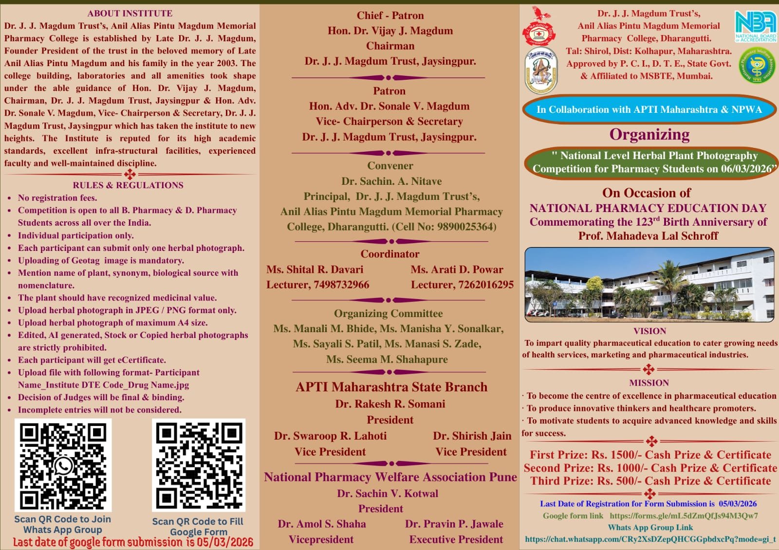 2. It is a matter of immense pleasure that we are organising  National Level Herbal Plant Photography Competition For Pharmacy Students on the occasion of National Pharmacy Education Day, Commemorating 123rd Birth Anniversary of Prof. M. L. Schroff in collaboration with APTI Maharashtra & NPWA, Pune.>
