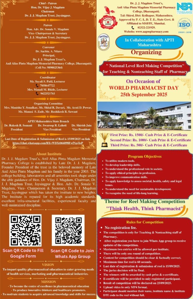National Level Reel Making Competition for Teaching and Nonteaching staff of Pharmacy in collaboration with APTIMaharashtra On Occasion of World Pharmacist Day